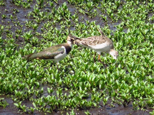Here is the Ruff alongside a Lapwing. The Ruff is so pale I suspect it is a juvenile. It is likely a male – they are larger than females. This bird seemed to have a problem with one wing – it is more than just the breeze blowing the feathers I feel.