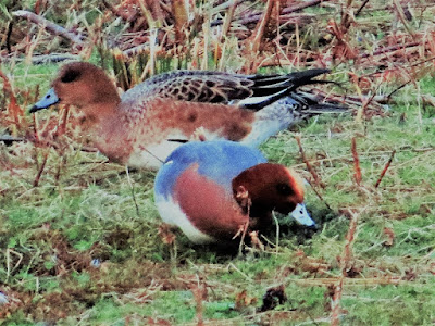 A pair of Wigeon, here in the shade. Note both sexes have a black-tipped blue-grey bill and white bellies. The dark area around the eye of the duck is a feature unique to wigeon - 'our' species and the New World species of American Wigeon. In that species the drake has a white rather than yellow forehead. As a result one of its local names is Baldpate.